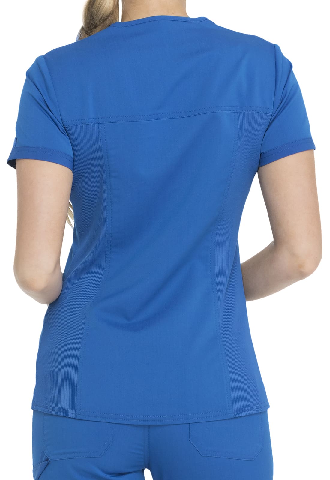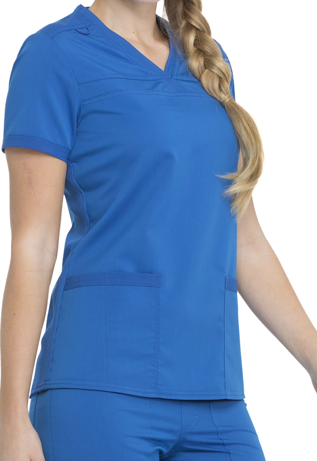 Ce haut élégant à col en V présente un col en tricot, deux poches plaquées à l'avant, des parties en tricot au dos pour le confort. Une boucle élastique a été ajoutée à l'empiècement droit pour maintenir votre badge d'identification dans la position idéale. Coupe contemporaine.