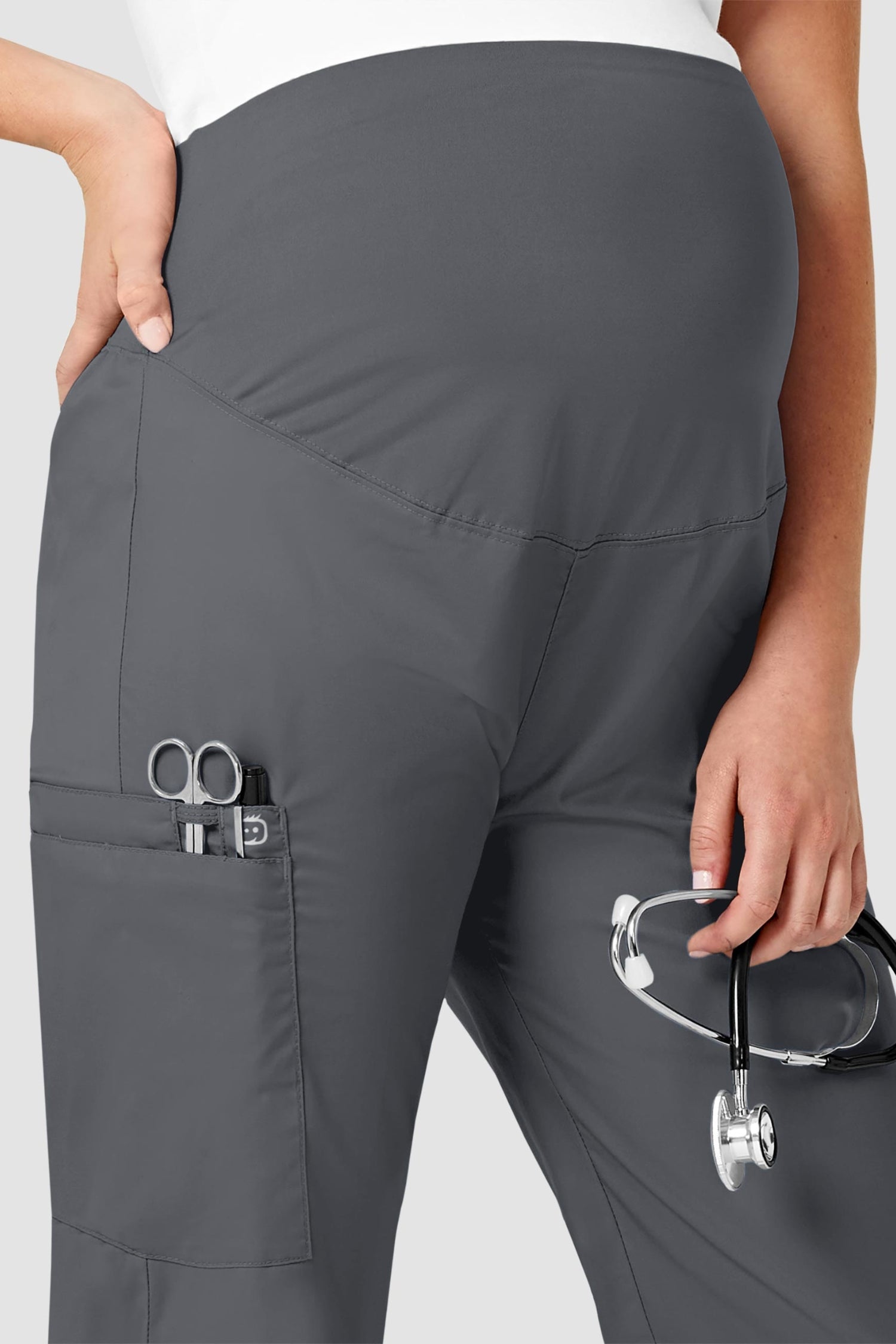 WonderWork a conçu un uniforme confortable et fonctionnel pour la grossesse. Le bas est doté d'une grande poches, d'une encoche pour stylo et d'une poche pour téléphone portable.