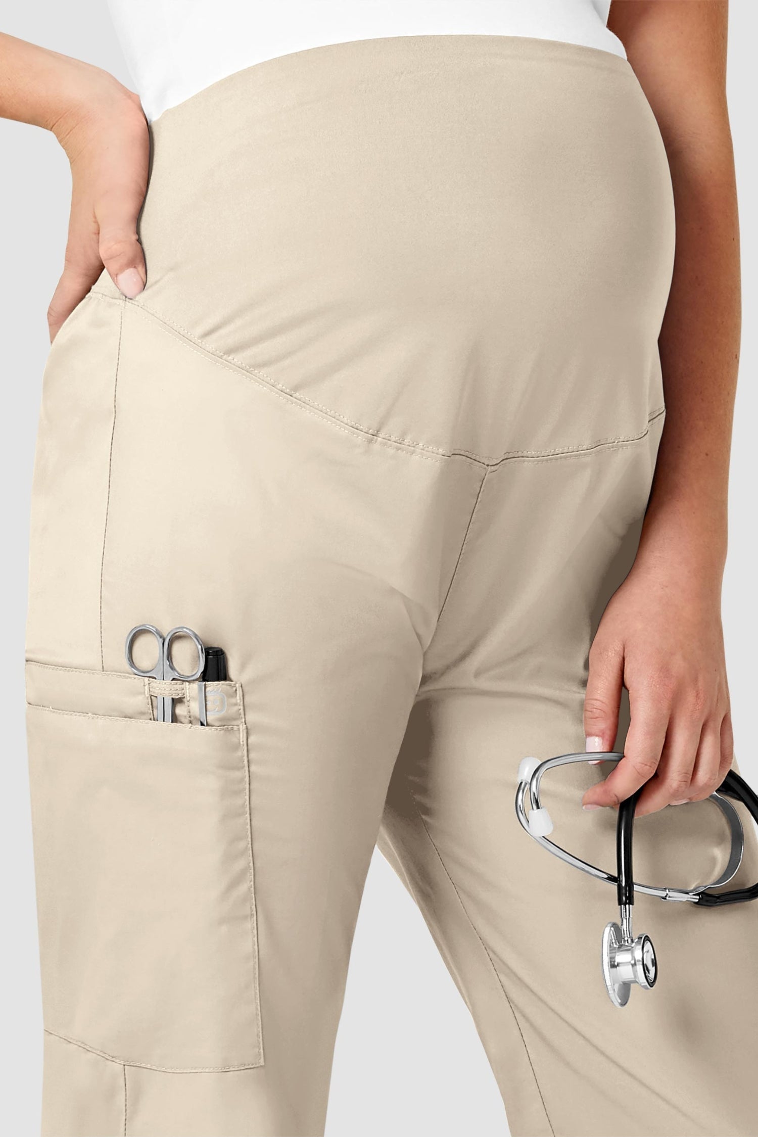 WonderWork a conçu un uniforme confortable et fonctionnel pour la grossesse. Le bas est doté d'une grande poches, d'une encoche pour stylo et d'une poche pour téléphone portable.